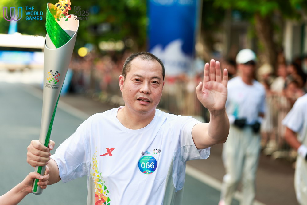 全国道德模范刘传健传递世运会火炬。成都市文明办供图